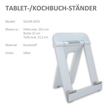 Vollständig aus Kunststoff hergestellt ist der Ständer. Der Ständer ist mit rutschsicheren und einer einstellbaren Klappfunktion versehen. Der Ständer kommt bei der Höhe auf Abmessungen von 19.5 cm, bei der Breite von 15 cm und bei der Tiefe auf 21.5 cm. Er ist aufgrund der Herstellung aus Kunststoff sehr leicht. Der Ständer ist vollständig in einem silbernen Design gehalten. Hervorzuheben ist beim Ständer noch der günstige Kaufpreis.