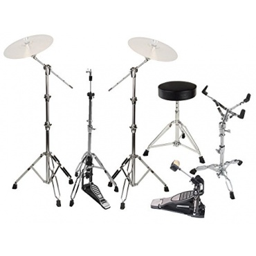Durch die Memory-Locks an den verstellbaren Hardwarekomponenten kann eine individuell gefundene Einstellung beim neuen Aufbau sofort wieder gefunden werden. Auch bei ausgedehnten Einsätzen ist durch die doppelstrebige Hardware eine optimale Standfestigkeit der Komponenten gesichert. Zum Set gehören zwei höhenverstellbare Galgenbeckenständer, ein professioneller Snare-Ständer, ein Drumhocker, eine Fußmaschine mit Doppelkettenzug und ein HiHat-Ständer mit einer stabilen Bodenplatte.