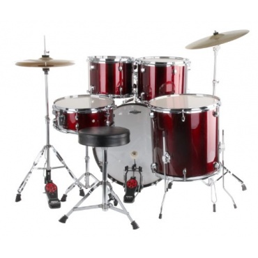 Das Hardware-Paket enthält eine Fußmaschine, eine HiHat-Maschine, Snare Drum-Ständer, einen Doppeltomhalter für die Tom-Toms, einem zusätzlichen Beckenständer und einem Drumhocker.