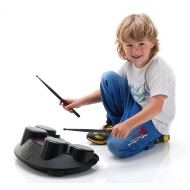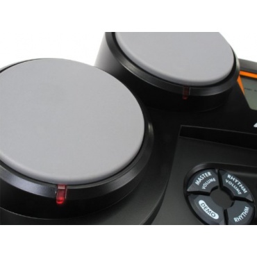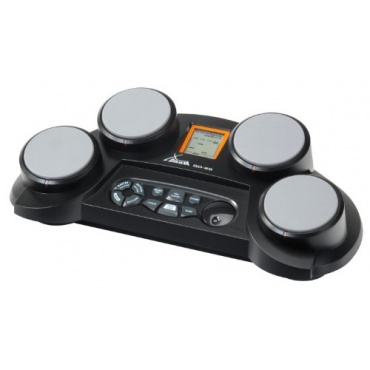 Das per Netzteil betriebene Drumset misst 48,6 x 30,4 x 17,6 cm und wirkt optisch sehr wertig und gelungen umgesetzt. Die vier Drums befinden sich an der Kopfseite leicht versetzt angeordnet, die Funktionstasten mittig zwischen beziehungsweise unter diesen. Insgesamt werden 70 Schlagzeug- und Percussionsounds simuliert, abgerundet werden die Extras mit 10 Soundeffekten und 50 vorgegebenen Rhythmen und Musikstilen.