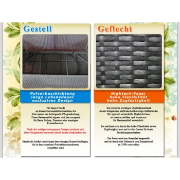Die XINRO® Gartenlounge 23tlg.Polyrattan schwarz ist ein echter Hingucker und kann vor allem durch die schwarze Farbe überzeugen. Zudem besticht die XINRO® Gartenlounge 23tlg.Polyrattan schwarz durch ihre Verarbeitung. Der Hersteller legt großen Wert auf die Verarbeitung des Produkt, was man auch an vielen Stellen erkennen kann. Die XINRO® Gartenlounge 23tlg.Polyrattan schwarz ist sehr hochwertig.