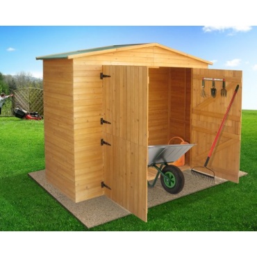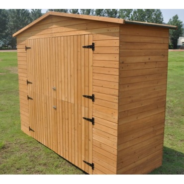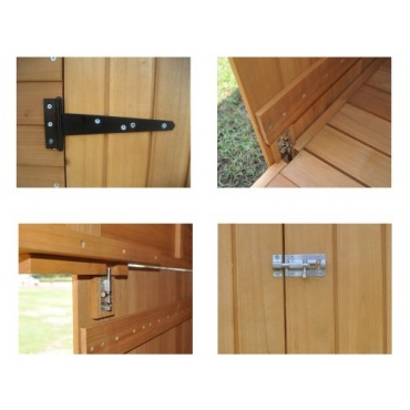Das XXL Gerätehaus von Serina hat eine Länge von 227 cm, ist 82 cm breit und 173 cm hoch. Es ist aus massiver Cunninghamia-Tanne gefertigt und wetterfest imprägniert. Das Dach ist bereits mit einer Dacheindeckung aus Bitumen versehen und hat einen Überstand von 7 cm. Die Beschläge des Gartenschuppens sind verzinkt und er lässt sich durch 3 verschiedene Möglichkeiten verriegeln.