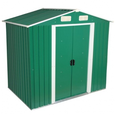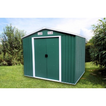 Das Gartenhaus ist optisch ausgesprochen ansprechend gestaltet. Sein hübsches Design lebt vom freundlichen Kontrast, den die sattgrüne Farbe und die weißen Absetzungen bilden. So fügt es sich trotz seiner praktischen Robustheit harmonisch und unauffällig in jedes Garten-Ambiente ein. Es lässt sich problemlos mit Regalen ausstatten und damit als Unterbringungsmöglichkeit vielfältig nutzen und optimieren. Für ein gutes Klima im metallenen Gehäuse sorgen Lüftungsschlitze über der Tür. Das Gerätehaus wird zerlegt geliefert und muss selbst aufgebaut werden.