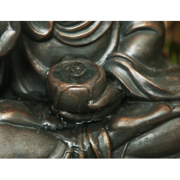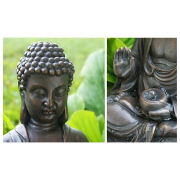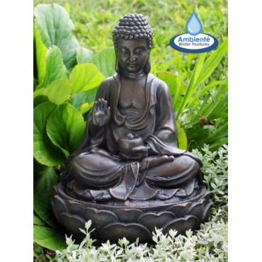 Der meditierende Buddhabrunnen aus Kunstharz hat eine Höhe von 39 Zentimeter und besteht aus einem Segment. Das Wasser tritt hinter dem Kopf aus und in der Schale. Der Brunnen ist mit acht LEDs ausgestattet. Davon befinden sich vier LEDs hinter dem Kopf und vier kleine Lampen in der Schale. Die Durchflussmenge kann an der Pumpe geregelt werden. Der Wasserkreislauf ist geschlossen. Der Druchmesser des Zierbrunnen ist dreissig Zentimeter.